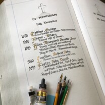 Names on certificates, wedding stationery/signs, poems, matt boards, name plaques, family trees, presentations, menus, and one off calligraphy pieces.